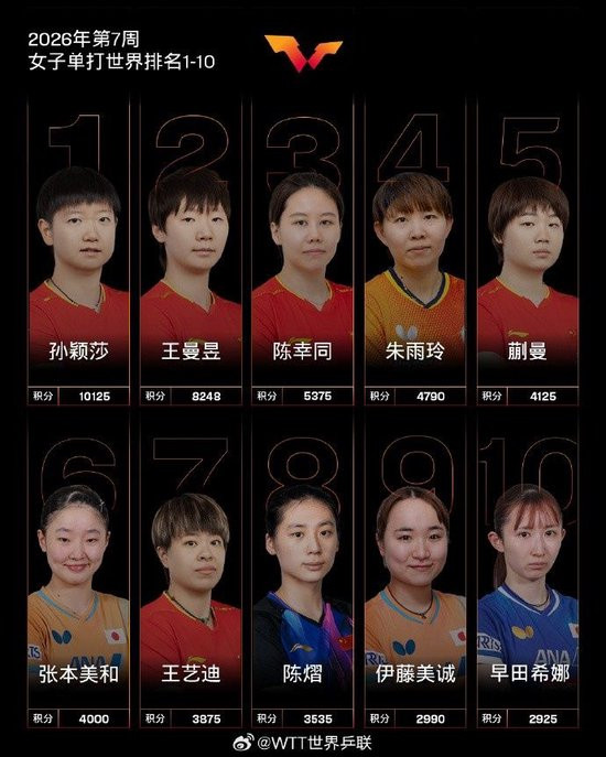 直播吧2月9日讯国外乒联公布了2026年第7周天下排行。 其他中国队球员,温瑞博排行第24,陈垣宇排行第28,陈俊菘排行第37,黄友政排行第42。 女子单打,中国队球员孙颖莎、王曼昱、陈幸同位列前三,蒯曼位列前五,王艺迪位列第七,陈熠位列第八。 其他中国队球员,石洵瑶排行第13,覃予萱排行第35体育赛事直播,何卓佳排行第38,纵歌曼排行第46,杨屹韵排行第47,王晓彤排行第48。